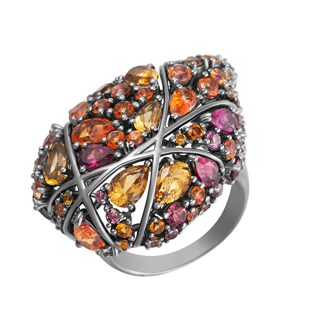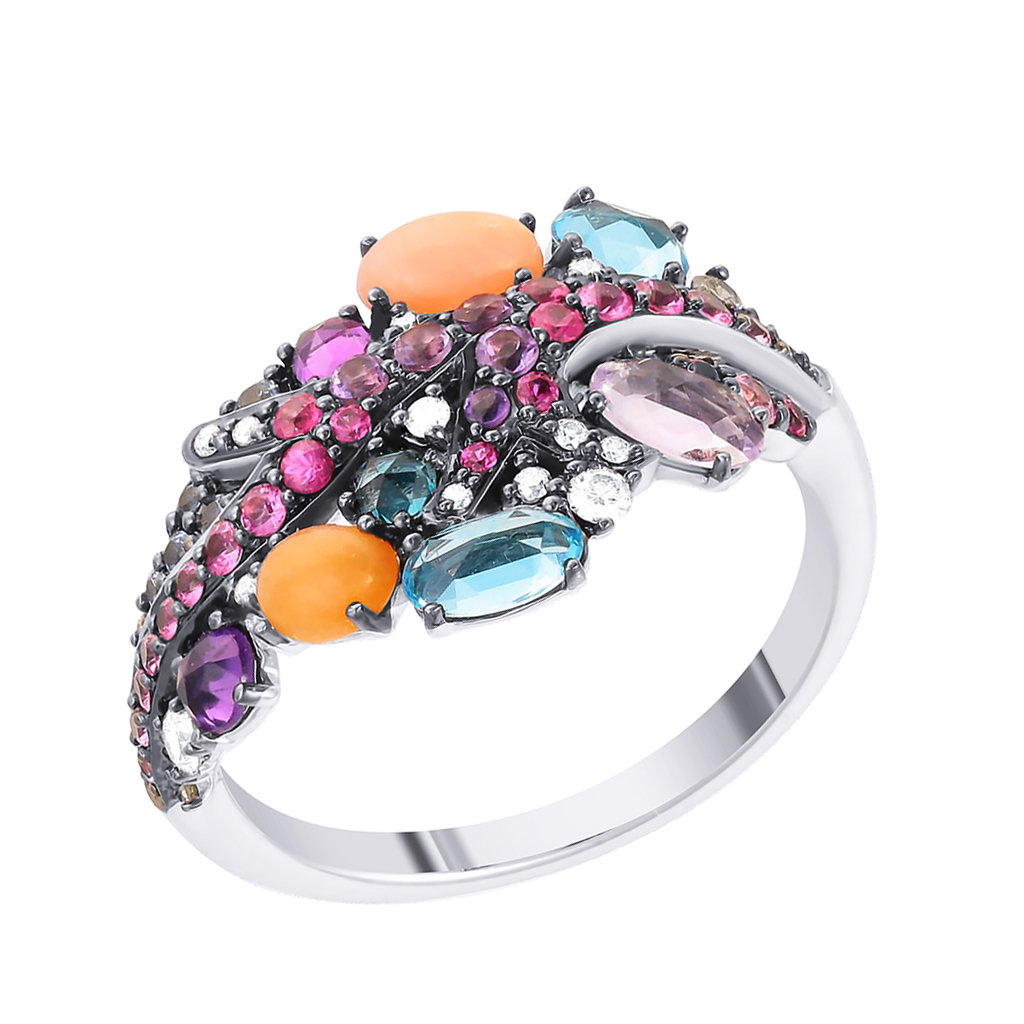 Кольцо из белого золота с бриллиантами, сапфирами, аметистом, раухтопазом, родолитом, топазом, жемчугом