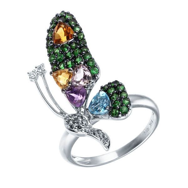 Кольцо из белого золота с бриллиантами, сапфирами, топазами, цветными