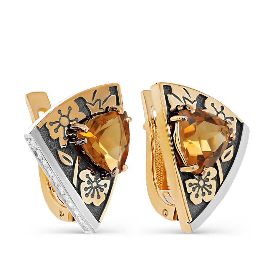 Серьги с английским замком из желтого золота с бриллиантами, цитринами, финифтями