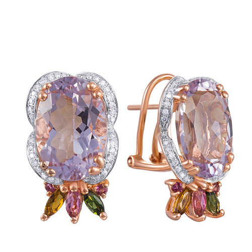 Серьги из красного золота с бриллиантами, турмалинами, аметистами