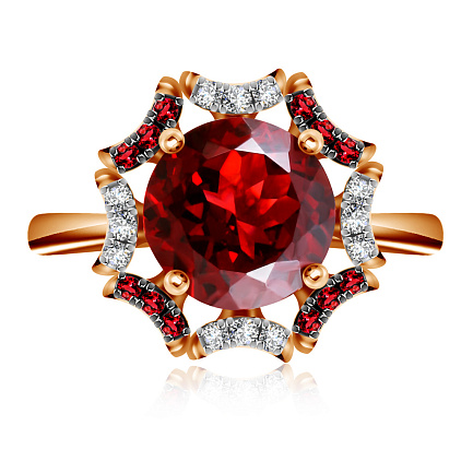 Золотое кольцо с благородным гранатом и сияющими бриллиантами - роскошный подарок. Кольцо смотрится одновременно изысканно и царственно.